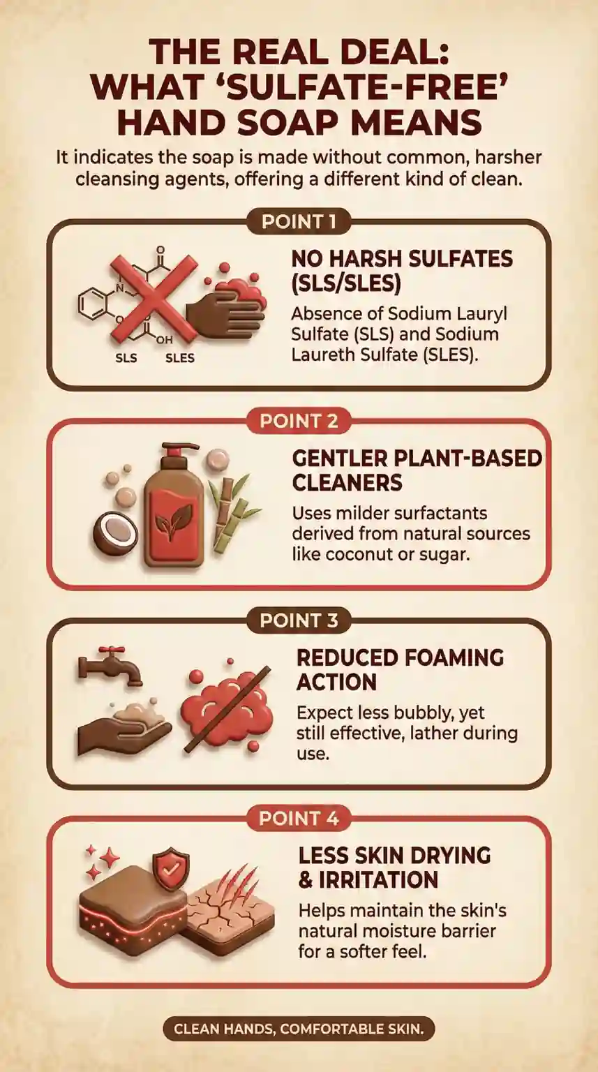 Sulfate-free hand soap is a formula made without sodium lauryl sulfate (SLS) or sodium laureth sulfate (SLES) — the synthetic surfactants responsible for stripping the skin's natural moisture barrier while creating lather.